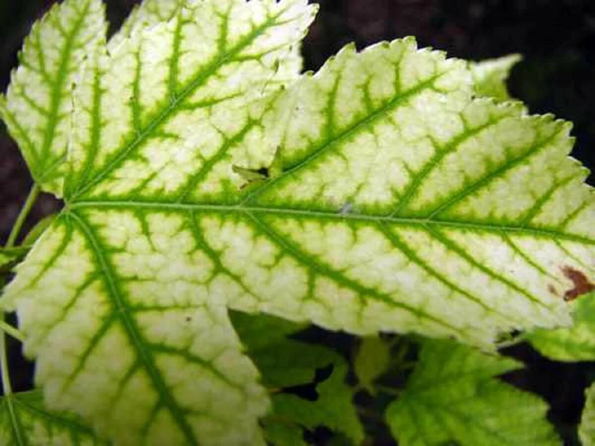 Дефицит железа. Данный элемент играет важную роль в функционировании хлоропластов. Если возникает нехватка железа, на листочках можно заметить проявления железного хлороза. Они приобретают желтый цвет, при этом прожилки, как и при нехватке магния, остаются зелеными. Однако в данном случае менять цвет начинают листья верхних слоев. Само растение также начинает страдать и угнетаться. Если случай запущенный, происходит отмирание листьев, практически полное замедление роста и гибель садового растения.