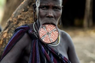 Африка таит в себе множество загадок и они не спешат открываться многочисленным исследователям. Например, некоторые связаны с африканским племенем мурси, представители которого поклоняются смерти. Мурси проживают на юго-западе Эфиопии. Членов этого племени узнать довольно просто – по оттопыренной нижней губе и вставленным туда керамическим тарелкам внушительных размеров. По одной из версий, такое «украшение» в эпоху работорговли спасало девушек и женщин от внимания со стороны европейцев. Правда, этнологи настаивают – у мурси представительница прекрасного пола, которая сможет вставить в нижнюю губу диск большего размера (их диаметр может доходить до 30 см), считается завидной невестой. Следовательно, выкуп за таких дам можно получить более весомый, нежели за тех, которые довольствуются 10-сантиметровыми тарелками. Понятно, что без предварительной подготовки стать лучшей невестой не получится, а поэтому девочки, чтобы удачно выйти замуж в будущем, с раннего возраста не только прокалыва