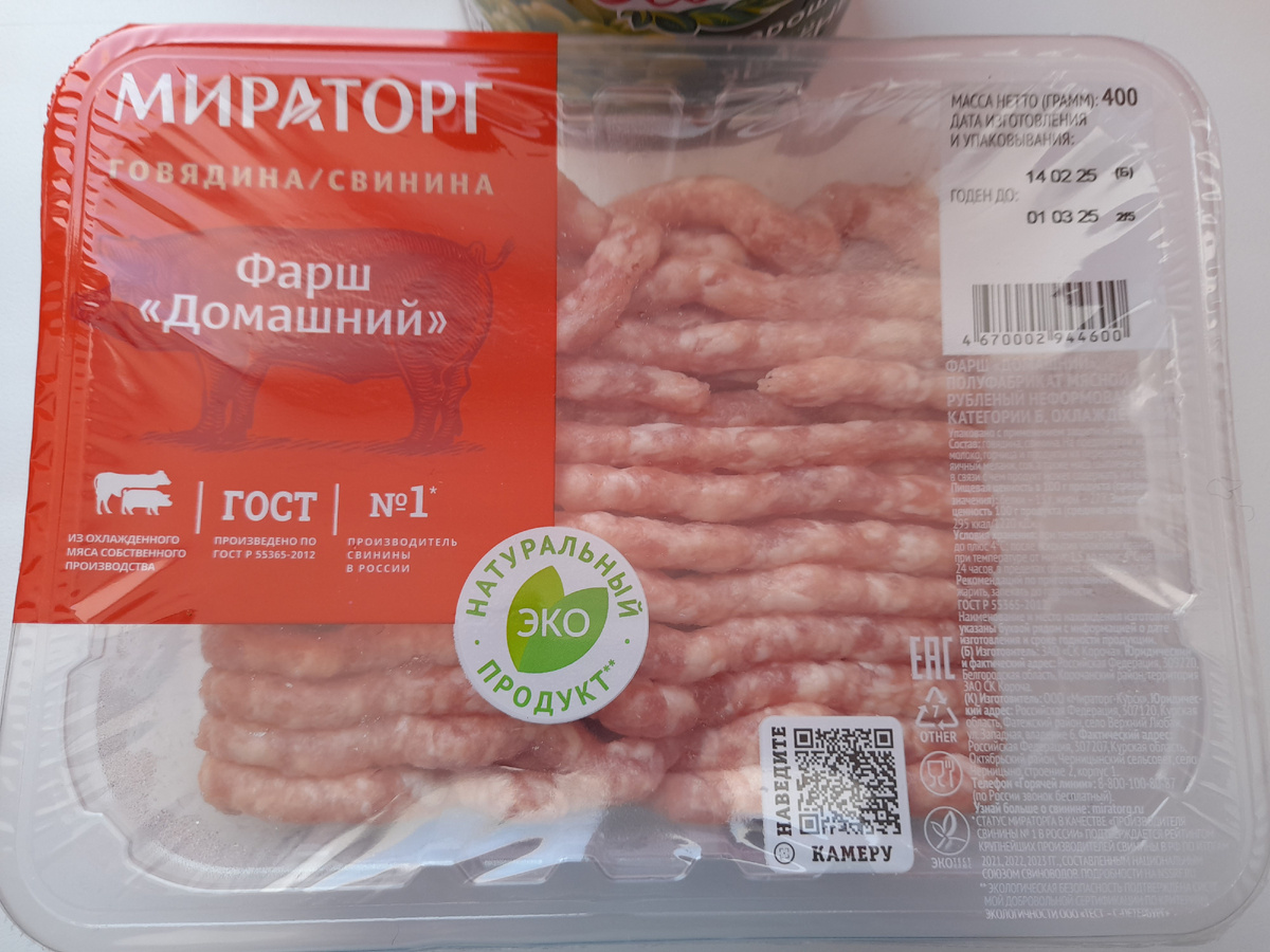 На термометре утром сегодня было на три градуса больше, чем вчера. 32! Мороз! Но в магазин нужно обязательно, у меня закончились запасы мяса, а без мяса ничего особо и не приготовишь. Прогноз обещает к обеду потепление до -16°, решила дождаться . Пошла в два часа дня, солнце ослепительно яркое, даже фотографии не стала делать по пути, перчатки снимать не хотелось. Чего - то мерзляка я стала. Старость не радость💯 В магазине не было большого выбора мясной продукции, только курицы тушками и те подозрительно дешёвые, по 169 рублей за килограмм. Курицу не хочу больше, съела то филе грудки и больше не хочется. Взяла фарш, не разу такой не брала, попробую, может он и правда из мяса😁 И снова горошек, захотелось. И на яблки в этом году напала, обычно зимой ела цитрусовые, а в этом году яблок хочется. Пришла и сразу два яблока помыла и стала есть. Вкусовые пристрастия могут изменяться, это нормально. Молоком запаслась, 2 пакета купила, этот пакет взяла на блины, у него 2,5% жирность. Для ко