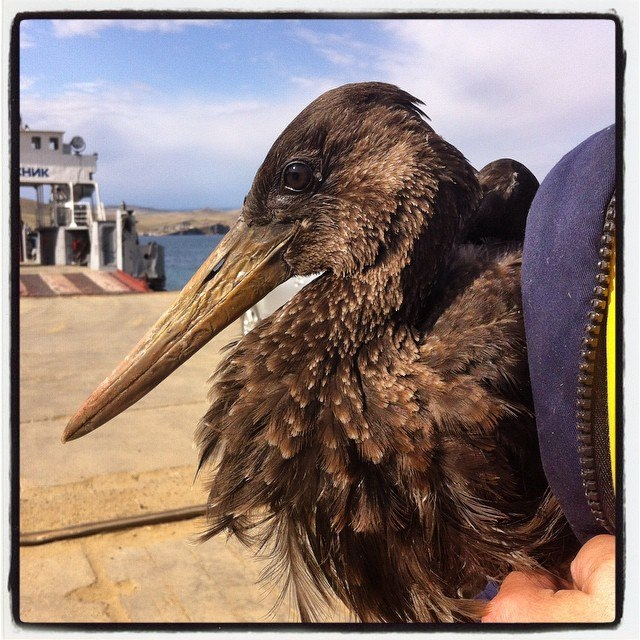 – Это редкий черный аист, занесенный в Красную книгу, – рассказывает Людмила Ивушкина. – Совсем молодой – месяцев пять от роду. Самец или самка – определить пока трудно. Видимо, он отбился от стаи, которая летела на зимовку в Китай, и ударился о скалы. Так и оказался в воде. Еще бы час – и птица погибла бы. Игорь ее действительно спас! – Я сидел в машине на берегу, – рассказывает спаситель пернатого Игорь Бандурка, – любовался красотами. И вдруг заметил, что над машиной кружат две большие птицы. Заинтересовался. Они то ко мне подлетят, то к воде. Приглядевшись, турист увидел – в воде тоже кто-то есть. Игорь вышел из машины и подошел к самому берегу. На байкальских волнах, качаясь и ударяясь о прибрежные камни, еле держалась большая черная птица. – Я вытащил ее из воды, – продолжает Игорь. – Сразу увидел, что у нее сильно сломано крыло – торчали кости, хлестала кровь. Птица была без сил, ее трясло. Мужчина укутал пернатого в свою куртку и принес в машину. В ней аист и провел всю ночь. А