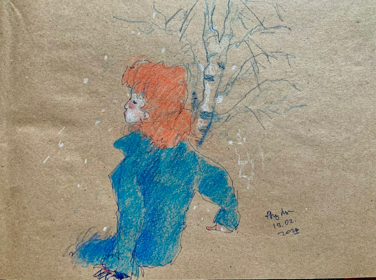 Рыжий папа, рыжий дед, рыжим стал весь белый свет! (с) Этот портрет навеян вот такой песней. - Я хочу, чтобы моя зима избавила меня от твоих химер, - поет Милен. А вокруг бродит лань и летают птицы. А это царство меланхолии. Красиво и грустно. Милен выступает в дуэте с Жаном-Луи Мюра. В эту историю возвращается лань из предыдущего фильма. - Мастер и Маргарита! - пишут люди в сети. Очень возможно! Здесь даже есть трамвай. А еще этот трамвай напоминает мне финальную сцену из фильма «Раба любви». Милен, маленькая фея, частый гость моих рисунков. Главным образом, в ролях Либертины и Гавроша, но также и просто девушки с копной рыжих волос. *** Стиль, в котором работает Милен, можно было бы охарактеризовать как готик-поп. Милен не боится говорить на сложные темы, заглядывать на чердак и в подсобку, не боится темноты, откровенных и даже жестоких сцен. Но все это решено достаточно театрально, условно. Так, что можно подумать, что все это происходит не здесь, а «где-то там, на другой планете»