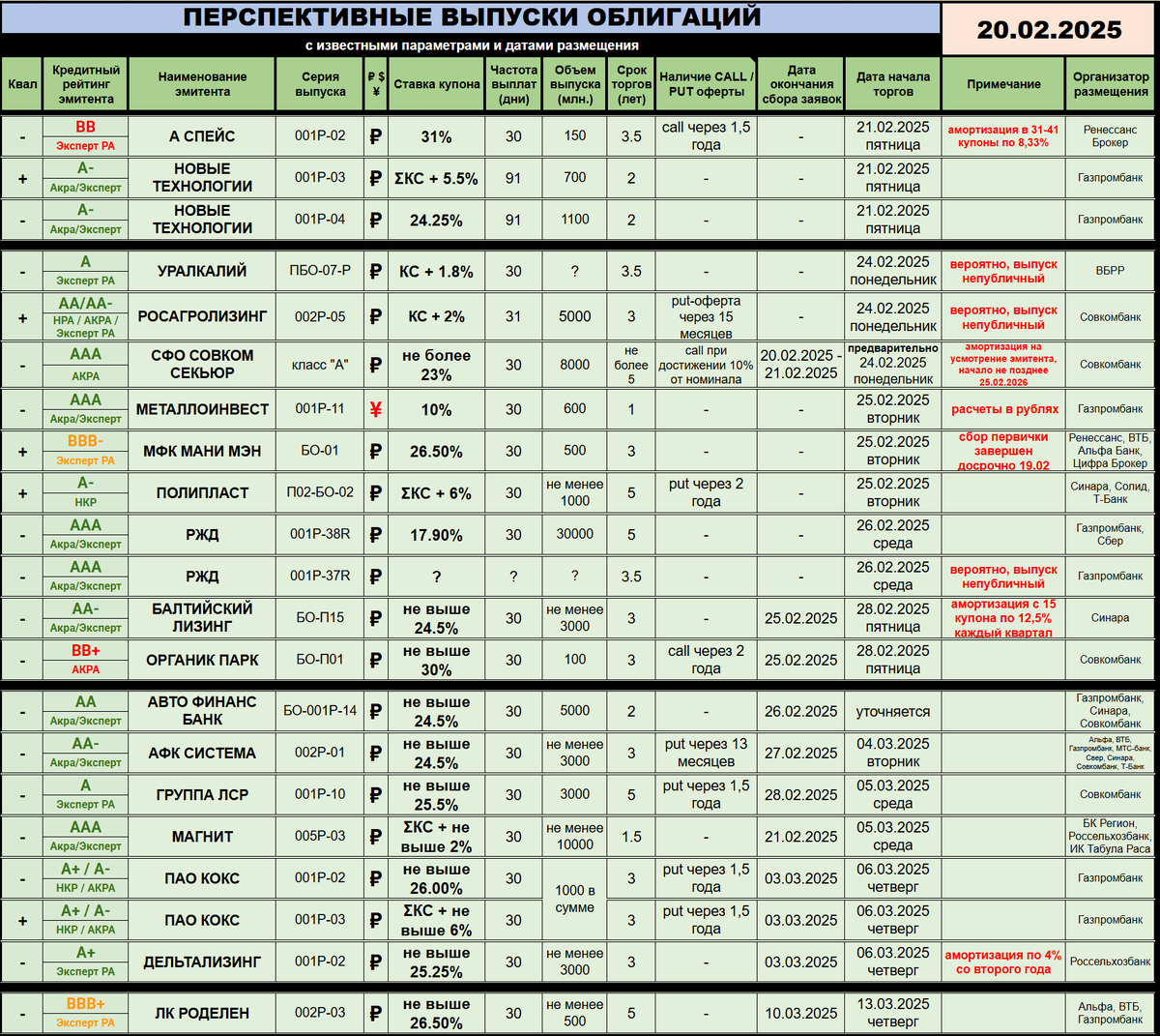 🤔 Добрый вечер, дамы и господа. Долговой рынок продолжает переживать нашествие облигационной саранчи, такого количества даже в конце года не было. Я пока еще пытаюсь все это систематизировать! К новостям :) ---------- 🆕 НОВЫЕ РАЗМЕЩЕНИЯ / АНОНСЫ: ❄️ МАГНИТ (🅰️🅰️🅰️) бездонен. Новый выпуск 005Р-03, встречайте уже завтра! Сбор заявок к вашим услугам :) Не менее 10 миллиардов рублей на 1,5 года, флоатер с ежемесячным купоном ΣКС + не выше 2%. Если выпуск требуется портфелю, то учтите, что торги начнутся лишь 5 марта. Организаторы: БК Регион, Россельхозбанк, ИК Табула Раса (кто это вообще...). ❄️ АВТО ФИНАНС БАНК (🅰️🅰️) щедр (в меру). Компания анонсирует бумаги БО-001Р-04, срок обращения которых составит 2 года. Привычные рынку ежемесячные выплаты, объем выпуска - 5 миллиардов рублей, ориентир купонной ставки - не выше 24,5%. При сохранении значения достаточно неплохо, но давненько мы его видели последний раз. Сбор заявок - 26 февраля, дата начала торгов уточняется. Организаторы