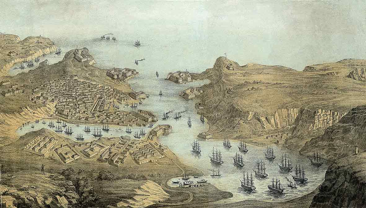 В третьей и четвертой бухтах Севастополя собрано все, что больше всего заслуживает пристального внимания. Город амфитеатром возвышается над этими заливами. Он занимает холм, который отделяет второй залив, названный Артиллерийским заливом, от третьего, названного Южным заливом. На мысе, отделяющем третью бухту от четвертой, была проведена огромная работа; она заключается в срезании скал, образующих этот мыс, на 6 футов над уровнем моря и (может быть, на 25-30 футоввыше, чтобына нем будут построены здания Адмиралтейства).