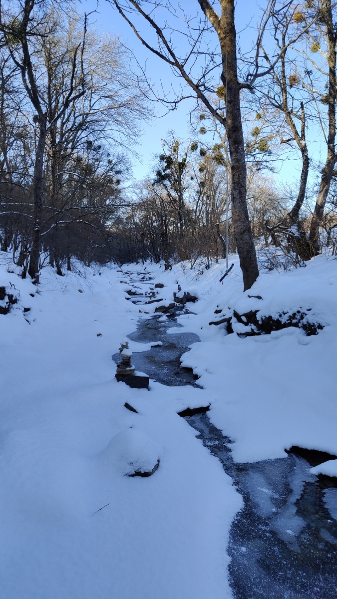Есть у меня знакомый водопад. Не очень далеко, но снега прилично навалило, дойти не просто. Мороз должен был его украсить, надо проверить. Пошел по реке, не очень удобно, лед где держит, а где проваливаешься. Скользко. Снег занёс камни, непонятно как ногу ставить. Все же добрался. Красота такая, что уходить не хотелось. Промок, устал, доволен.