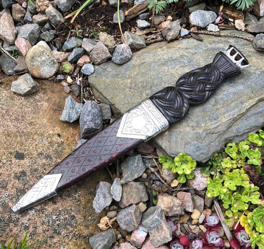 Скин-ду — это минимализм в его высшей форме. Лезвие обычно не превышает 7–10 сантиметров, а рукоять украшена узорами или инкрустирована камнями. Традиционно рукоять делали из дерева, рога или слоновой кости, а позже — из металла с декоративными элементами. Ножны часто украшались орнаментами, которые рассказывали истории клана или владельца.