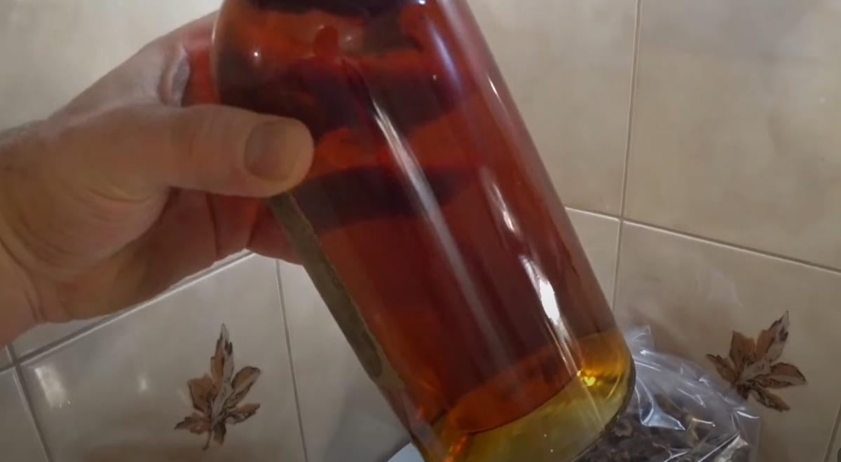Все ингредиенты отправляем в емкость, заливаем спиртовой основой и герметично закрываем. Настаиваем 14 дней в темном месте при комнатной температуре. Первые 3 дня емкость взбалтываем пару раз в день.