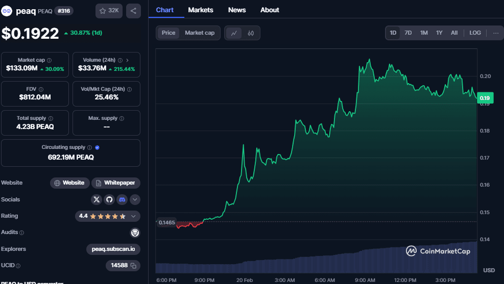 В феврале 2025 года на рынок вышла «темная лошадка» в сфере Депина — Peaq (PEAQ). Всего за два дня цена Peaq взлетела на 40%, достигнув в определенный момент $0,194, при рыночной стоимости более $134 млн (согласно отчетным данным) и 24-часовом объеме торгов более $30 млн. Этот взрывной рост привлек внимание большого числа инвесторов, а также привлек большое внимание благодаря ежегодному прогнозу известного исследовательского института Messari. В отчете Messari «Тенденции криптовалют» за 2025 год Peaq был указан как потенциальная цель, которая «может превзойти все проекты уровня 2» и рассматривается как основная движущая сила развития DePIN (децентрализованная инфраструктурная сеть) и RWA (токенизация физических активов).