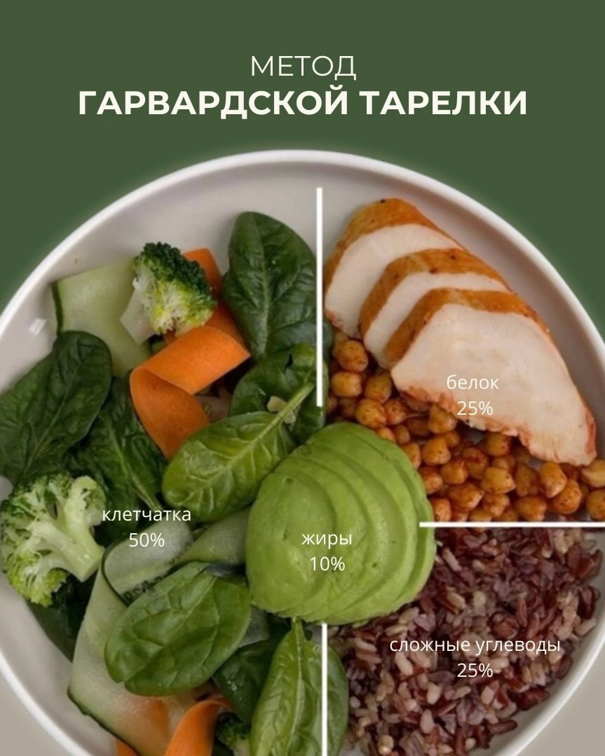 Гарвардская тарелка: принцип сбалансированного питания🍽️ Скорее всего, вы слышали о «тарелке», разделенной на несколько секторов – это основа метода, разработанного учеными Гарвардского университета для создания сбалансированного рациона. Как выглядит «Гарвардская тарелка»? Тарелка диаметром 24–26 см делится на три основных сектора, каждый из которых отвечает за определенную группу продуктов: 🥒 Овощи и фрукты (половина тарелки) – это источник клетчатки, антиоксидантов, витаминов и минералов для укрепления иммунитета и поддержания общего здоровья. 🍚 Цельнозерновые продукты (четверть тарелки), такие как бурый рис, киноа или цельнозерновой хлеб, обеспечивают организм сложными углеводами для энергии. 🍗 Белки животного и растительного происхождения (еще четверть тарелки) – мясо, рыба, орехи, бобовые и молочные продукты. Белок поддерживает мышечный тонус, восстанавливает ткани и улучшает обмен веществ. Основные принципы метода: • Разнообразие и качество продуктов • Минимум насыщен