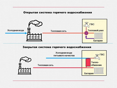 Вот наглядная картинка, что такое горячее водоснабжение: открытая или закрытая система. Видите, при закрытой в дом входит ДВЕ ТРУБЫ, одна из которых нагревается, и вода становится горячей. Вот здесь и положено брать двухставочный тариф.