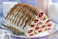 Торт из блинчиков с вишней и сметанным кремом - отличное угощение на Масленицу! Собирается этот блинный торт по принципу торта "Монастырская изба", а это значит, что его разрез получается эффектным и аппетитным! Продукты (на 8 порций) Блины - 15 шт. (диаметром 22 см) Сметана 20% жирности - 500г Вишни - 600 г (масса замороженных ягод с косточками) Сахарная пудра - 5 ст. ложек Шоколад - 50 г 1)Сметанный крем для блинного торта нужно готовить из жирной густой сметаны с добавлением сахарной пудры. Взбиваем пару минут. (Если сметана жидкая или вы не уверены, что после взбивания крем будет стабильным, сметану лучше отвесить. Для этого выложите сметану в несколько слоёв марли и подвесьте на ночь для стекания сыворотки) 2)Из вишни вытаскиваем все косточки , если они есть. Вишню можно брать любую : замороженную, свежую, консервированную. 3) на тарелку выкладываем блинчик. На одной стороне выкладываем вишню в ряд и свариваем в трубочку 4)на тарелку выложите 5 готовых трубочек с вишней