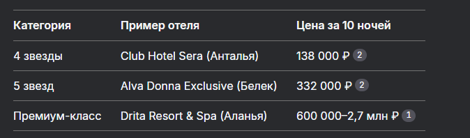 В феврале 2025 года российские туристы получили неожиданный подарок: летние туры в Турцию подешевели на 6–7% из-за укрепления рубля. Курс доллара опустился до 91,03 ₽, а евро — до 94,9 ₽, что стало самым низким показателем за последние 5 месяцев. Это позволило туроператорам снизить цены на пакетные туры, включающие перелет, проживание и питание. Например, семья из четырех человек может сэкономить до 60 000 ₽ при бронировании отдыха в июне. Ключевые факторы снижения цен: После прочтения этой статьи обязательно подпишитесь на наш канал, чтобы не пропустить новые интересные публикации. Цены на туры варьируются в зависимости от курорта, категории отеля и даты вылета. Например, 10-дневный тур в 4-звездочный отель Антальи с вылетом 11 июня обойдется: Сравнение цен по категориям отелей (на двоих): Совет: Самые выгодные предложения доступны при раннем бронировании. Например, путевки в сентябре на 11 ночей в 5-звездочные отели стоят от 82 000 ₽, что на 30% дешевле июльских цен. Интересный факт:
