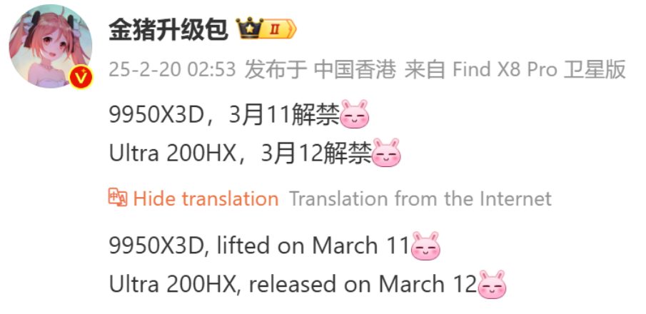 Ровно через три недели AMD снимет эмбарго на 12- и 16-ядерные процессоры Ryzen с технологией 3D V-Cache и архитектурой Zen 5. Этот запуск станет следующим этапом после выпуска 8-ядерного процессора Ryzen 9800X3D в ноябре. Ryzen 9800X3D по цене 479 долларов стал очень успешным запуском, и его доступность начала стабилизироваться только в текущем месяце. AMD обещает, что Ryzen 9 9950X3D станет самым быстрым 16-ядерным процессором для игр. Хорошая новость в том, что мы скоро узнаем, правда ли это, учитывая, что снятие запрета на обзоры теперь, как сообщается, назначено на 11 марта, согласно информации Golden Pig Upgrade. Портал Videocardz.com получили подтверждение, что дата запуска также определена, и неудивительно, что это произойдет на следующий день, 12 марта: Запуск AMD Ryzen 9 9000X3D: • 11 марта: Обзоры; • 12 марта: Запуск. Intel Core Ultra 200HX • 12 марта: Обзоры; • ?: Запуск. Утечка от Golden Pig также показывает, что Intel снимет эмбарго на свои процессоры Core Ultra 200HX Arro