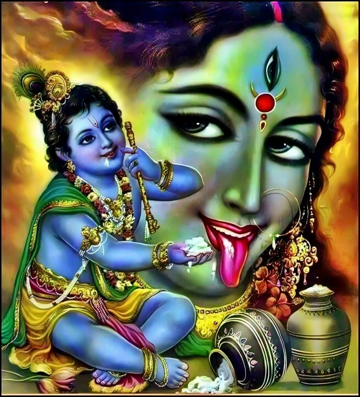 То есть, когда проводятся параллели между десятью Махавидьями (десятью тантрическими женскими божествами) и десятью аватарами Вишну, Кришна всегда отождествляется с Кали. Либо он - воплощение Кали, либо он - её сын.