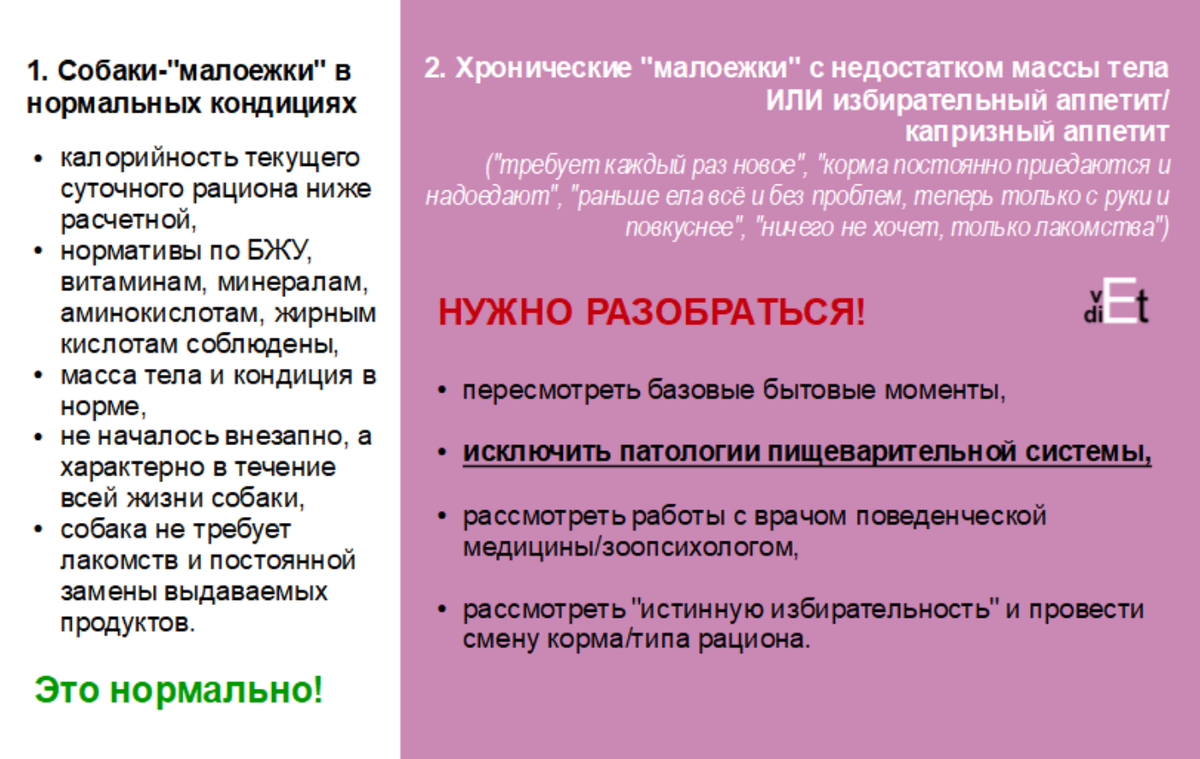 Под описание "малоежек" и "пищевых капризуль" обычно подгребают всех собак с теми или иными изменения пищевого поведения в направлении маленьких порций/специфического рациона. Но наиболее широко можно определить два типа таких животных: 1. Собака-"малоежка". Собака всегда ела мало. При этом она в нормальных кондициях (адекватно стройная и подтянутая, совсем не истощенная) и НЕ капризничает "это было вчера, сегодня нужно другое" - т.е. просто стабильно ест свою привычную еду, в небольших (=но стандартных для нее) объемах. 2. Избирательный аппетит/капризный аппетит ("ей все не нравится", "требует каждый раз новое", "корма постоянно приедаются и надоедают", "раньше ела всё и без проблем, теперь только с руки и повкуснее", "ничего не хочет, только лакомства") ИЛИ хроническая "малоежка" с недостатком массы тела. Рассмотрим данные типы подробнее. Средняя расчетная потребность в энергии для собаки конкретного возраста, типа активности и веса может НЕ ПОДХОДИТЬ конкретному животному! В целом п