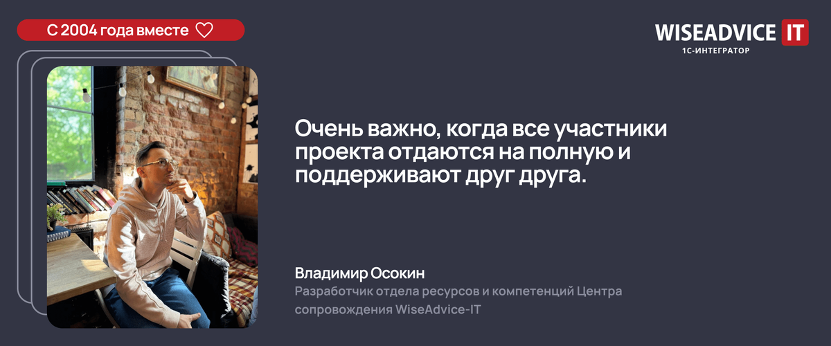 Владимир Осокин, разработчик отдела ресурсов и компетенций Центра сопровождения WiseAdvice-IT, поделился своей историей успеха, рассказал, за что благодарят клиенты и почему важно работать в команде. — Расскажи, где учился и как попал в WiseAdvice-IT? — Закончил МГТУ-МАСИ по курсу «Прикладная информатика». В 2004 году, будучи на втором курсе, мой приятель пригласил меня на стажировку в Интелис (c 2010 г. WiseAdvice-IT). Скажем так, это была частая практика для студентов, чтобы в свободное от учебы время профессионально развиваться. Поэтому я охотно согласился. Пока я стажировался и работал в компании, закончилось мое обучение в университете, и нужно было подыскивать первое рабочее место. А поскольку во время стажировки я уже трудоустроился в Интелис, то решил там остаться и ничего нового не искать. Тем более к этому моменту началась работа на проекте, и я был втянут в процесс разработки. Вот так и оказался в WiseAdvice-IT. До сих пор работаю в этой компании! — Какая твоя первая должнос