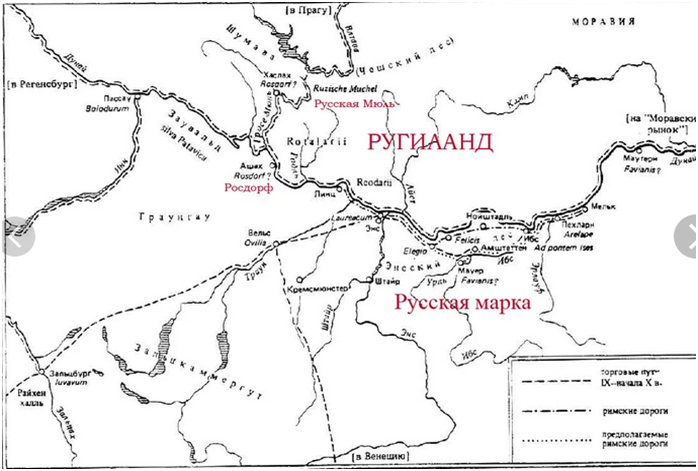 Характерно оно и для северо-дунайских земель, о чем свидетельствует перечисление у «Баварского географа» названий живущих восточнее франков племен, таких как Sebbirozi, Attorozi, Uuilerozii, Zabrozi, Chozirozi, в которых явно присутствует искаженное имя ругов. Только после появления в центральной Европе мадьяр названия этих племен исчезают, зато в венгерских источниках и «Житии Конрада, архиепископа Зальцбургского» имеются упоминания о «Русской марке».