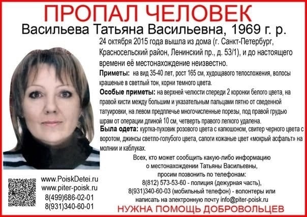 Здравствуйте, друзья! Сегодня статья будет о еще одном поиске, который и по сей день остается безрезультатным, хотя прошло почти десять лет. 24 октября 2015 года в Санкт-Петербурге пропала женщина - Васильева Татьяна. На момент пропажи ей было сорок шесть лет. Женщина эффектная, контактная и открытая. Она выглядела куда моложе своего настоящего возраста. По словам очевидцев, последний раз Татьяну Васильеву видели на проспекте Героев. Уже позднее появится информация, что женщину видели в ночном магазине в компании двух лиц неславянской внешности. После той роковой ночи она исчезла без следа…