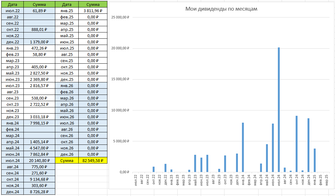 Начнем с графика, где показаны все полученные мной дивиденды по месяцам.