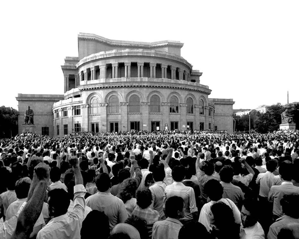 В Ереване акции проходили на Театральной площади (ныне площадь Свободы), перед зданием Матенадарана и на главном проспекте (ныне Маштоца). Среди первых организаторов и лидеров митингов были экономист Игорь Мурадян, поэтесса Сильва Капутикян и другие. Число участников протестов росло с каждым днем. Первые в истории СССР стотысячные митинги, демонстрации и шествия прошли именно в Нагорном Карабахе и Армении. Карабахское движение обозначило стремление армянского народа к демократии путем самоопределения и объединения.