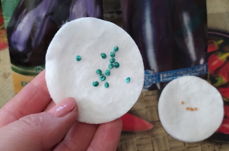 Замачиваем семена на влажных ватных дисках. Не рекомендую применять марлю, поскольку ростки могут между нитками прорасти и их легко оторвать от семечки. Замачиваю семена на ватных дисках в пластиковой тарелки, емкость накрываю пленкой, чтобы внутри образовался благоприятный микроклимат. Через сутки семена набухают и их можно сеять.