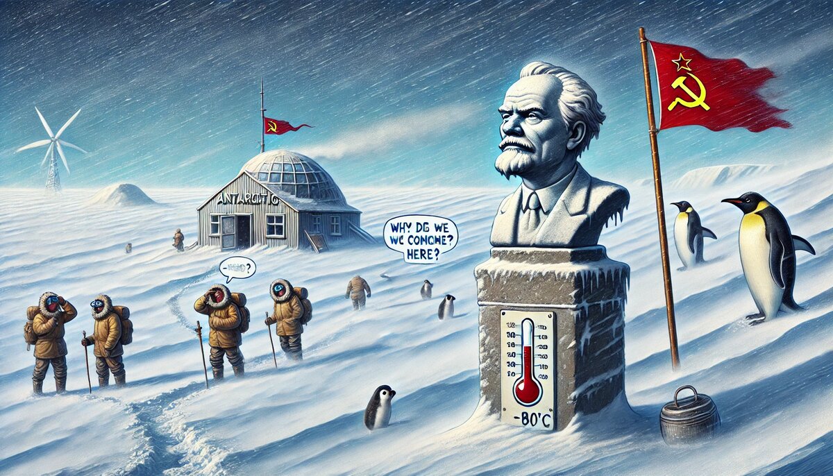 Представьте: бескрайняя белая пустыня, где температура падает до -80°C. Здесь даже пингвины сказали бы: "Нет, спасибо, это слишком". Единственное, что напоминает о людях — заброшенная советская станция и бюст Ленина, который с 1958 года безмолвно наблюдает за снежными просторами. Кажется, будто он думает: "Ну и куда меня занесло?"