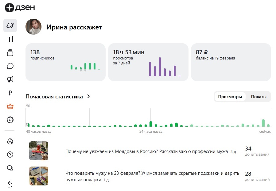 Я создала канал 18 ноября 2024 года, первую статью выложила 22 ноября. Фактически каналу 3 месяца было 18 февраля, но так как статистика, а в частности денежки-бабосики приходят с опозданием в два дня, я показываю данные немного позже «официальной» даты. Вообще, я планировала эту статью 20 февраля выложить, но я не успела её дописать до конца дня, поэтому выкладываю сегодня. Скрины все сделаны 20 февраля.