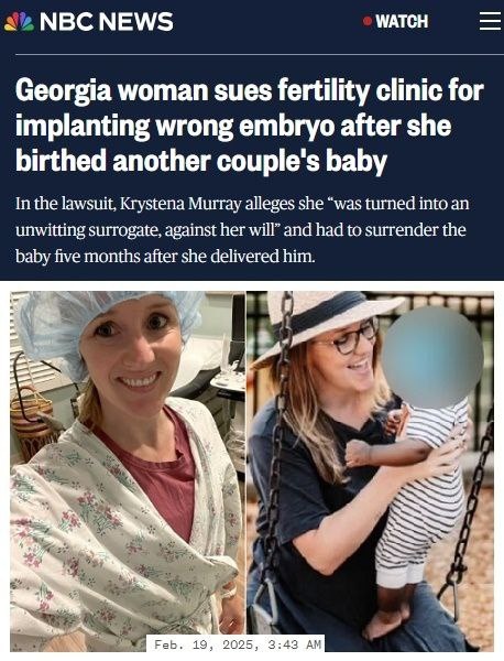 38-летняя жительница штата Джорджия Кристена М. договорилась с клиникой ЭКО об искусственном оплодотворении и подобрала себе такого же как она донора спермы – белого блондина с голубыми глазами. С энтузиазмом выносила подсаженный ей эмбрион и родила здорового… негритёнка. Удивилась безмерно, но полюбила малыша, ведь как-никак родной сынишка. Полагала, что врачи накосячили только с донором спермы. Однако в клинике ошиблись и с самим эмбрионом. То есть Кристена эта даже не биологическая мама. А настоящие биологические родители, обо всём этом деле узнав, отжали ребёнка через суд. И спустя пять месяцев Кристене пришлось добровольно отказаться от сына, к которому она искренне привязалась.