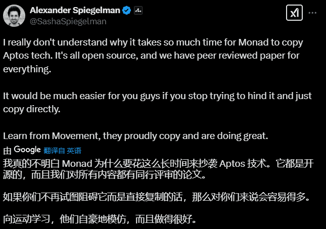 В ответ на это соучредитель Monad Джеймс Хансакер резко отреагировал, заявив, что базовая логика BlockSTM берет свое начало в программной транзакционной памяти (STM) и теории оптимистичного управления параллелизмом (OCC), предложенной в 1979 году, и подчеркнул, что он изучал соответствующие технологии в среде Haskell на раннем этапе и никогда не ссылался на код Aptos. Он пошутил: «Если бы Aptos не начал борьбу, я бы даже не подумал об этом проекте».