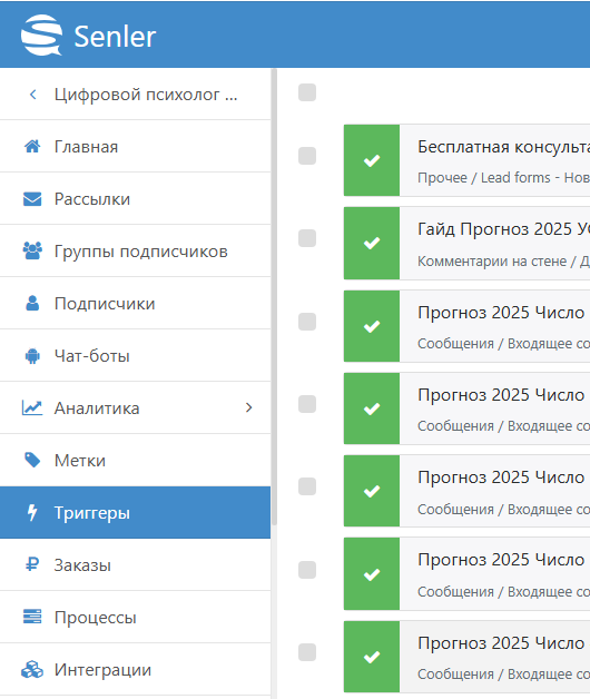 Senler подключили не просто так — это «мозг» автоматизации. Рассылки, триггеры, сбор заявок — всё в одном месте.