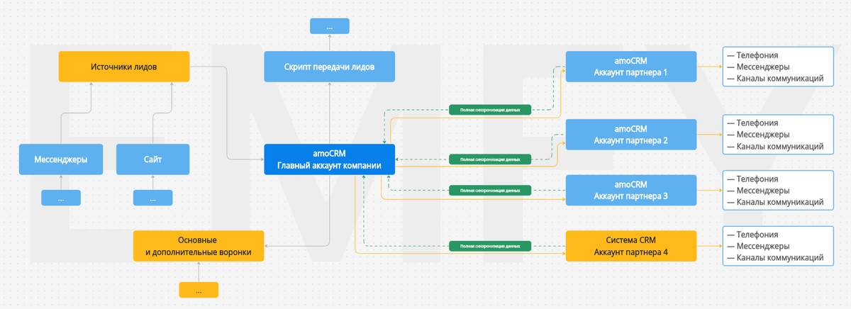 Синхронизация генерального аккаунта с аккаунтами подразделений/филиалов позволяет руководителям со стороны одного аккаунта владеть данными и информацией по всем подразделениям, без необходимости перемещения в другой аккаунт и лишних действий.