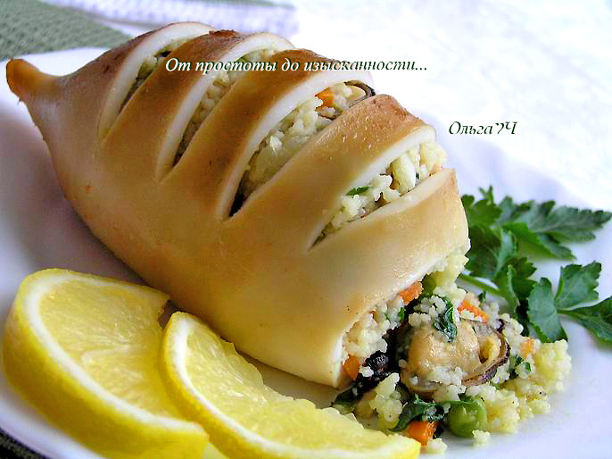 Предлагаю попробовать сегодня фаршированных кальмаров - здесь воедино слились и основное блюдо и гарнир! Кальмары будто специально созданы, чтобы их фаршировать. А ваша фантазия подскажет, чем именно. Это может быть мясной фарш, рыба, овощи или морепродукты. Моя фантазия подсказала постный и сытный вариант. Попробуйте, получилось очень вкусно и эффектно! За идею рецепта благодарю Викторию.