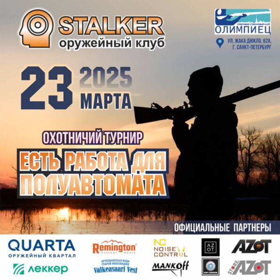 23 марта 2025 года в Санкт-Петербурге на территории ССК «Олимпиец» состоится традиционный турнир «Есть работа для полуавтомата», организованный специально для владельцев помповых и полуавтоматических ружей. Мероприятие проводится в преддверии весеннего охотничьего сезона и собирает лучших стрелков и охотников. Соревнования включают 4 тематические площадки, на которых участникам предстоит продемонстрировать своё мастерство в стрельбе по 20 мишеням: 📌 Особенности турнира: 🔹 Победители турнира (занявшие первые 3 места в каждой категории) получат ценные призы от партнеров мероприятия.