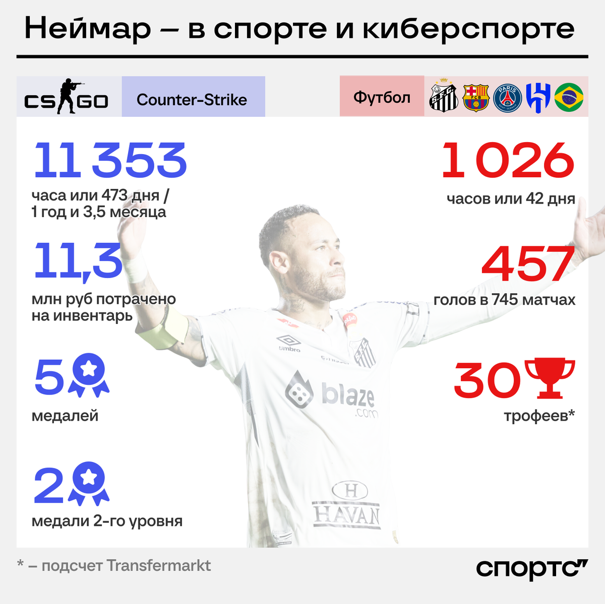 Но в футболе результат гораздо лучше. Неймар – фанат не только футбола, но и Counter-Strike, в который рубился очень часто. Flow Games подсчитал, что у бразильца наиграно 11 353 часа в эту игру. В пересчете на дни – аж 473 без перерыва! За компьютером – в 17 раз чаще, чем в официальных матчах В сравнении с футболом киберспорт явно побеждает. Справедливости ради, многочасовые тренировки тут тоже не учтены. При этом мы посчитали матчи Неймара за молодежную и олимпийскую сборные Бразилии. Неймар начал играть в CS не раньше декабря 2016 года – и за это время наиграл более 11 тысяч часов. Еще у него 6125 часов в других играх: например, 5084 – в PUBG, в FC 25 – 530, в FIFA 23 – 192. Всего больше 17 тысяч игровых часов – это 728 дней, то есть фактически два года. Согласно подсчетам Transfermarkt, Неймар пропустил 1391 день в футболе из-за травм – почти четыре года в общей сложности. За это время он провел бы на 242 матча больше. С 2017 года, когда Неймар стал активным игроком CS, он добыл едв