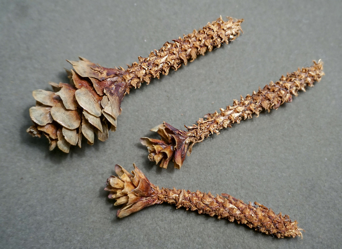 Белка отгрызает чешуйки у основания и после нее остается узкий стержень с некоторым количеством чешуек на вершине. Лесные мыши обгрызают чешуйки дальше от стержня, и «огрызок» получается довольно толстым.