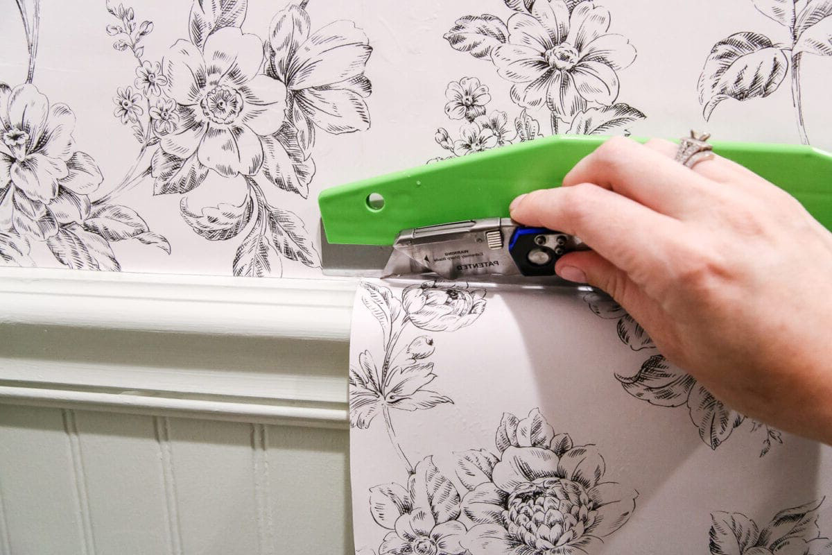 - Обрежьте излишки: дождитесь, пока обои слегка подсохнут (10–15 минут), и обрежьте верх и низ канцелярским ножом по линейке.