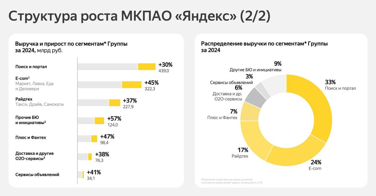 Именно такой заголовок я увидел в одном из слайдов презентации компании к итогам работы в 2024 году. А еще Яндекс стал самой дорогой компанией Рунета. Сегодня разбираемся с финансовым отчетом Яндекса за полный 2024 год и прикинем перспективы бизнеса. Итак, в отчетном периоде выручка Яндекса превысила 1 триллион рублей, продемонстрировав рост в 37% год к году. При этом компания прогнозирует рост выручки как минимум на 30% в 2025 году, а показатель скорр. EBITDA не менее 250 млрд руб. При таких масштабах заявленный прогноз - задача крайне амбициозная, но выполнимая. Фактически за 2025 год мы можем увидеть выручку в размере 1,4 трлн рублей. Выручку драйвят практически все сегменты бизнеса с динамикой от 30% до 57%. Поиск и портал нарастил выручку на 30%, а скорр. EBITDA увеличилась на 27%. Компания держит фокус на операционной эффективности и увеличивает маржинальность бизнеса, при этом не забывая реинвестировать заработанные деньги. Сегмент Электронной коммерции, Райдтеха и Доставки такж