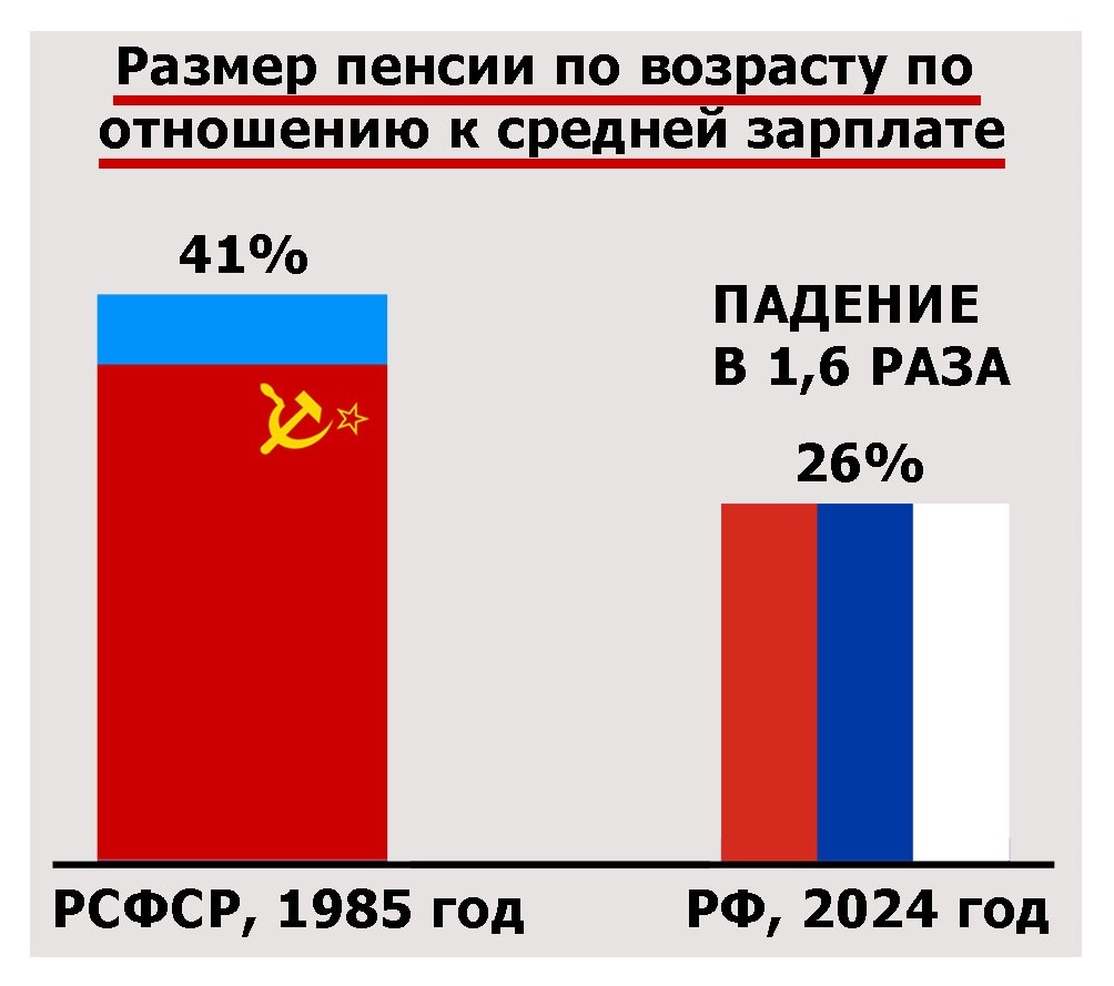 Расчёты показывают: чтобы получать пенсию примерно в 50 тысяч рублей, россиянин должен заработать 300 пенсионных баллов. Однако чтобы при средней зарплате заработать столько баллов, надо трудиться… 75 лет! 50 тысяч при нынешних ценах – это совсем немного. Но и такую скромную пенсию в капиталистической России может заработать только биоробот со сменными органами. Ведь для человека из плоти и крови проработать 75 лет нереально. Поэтому у тех трудящихся, которые не киборги, пенсии будут намного-намного меньше. И выжить на них будет очень непростой задачей. Кстати, по отношению к средней зарплате средняя пенсия по возрасту с 1985 года уменьшилась в 1,6 раза. Поклонники капитализма возразят: но есть же капиталистические страны с большими пенсиями: Германия, Франция, США