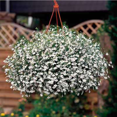 Этот сорт предназначен для выращивания в открытом грунте, висячих корзин и уличных вазонах. Растения отличаются быстрым ростом и достигают длины до 50 см. Стебли тонкие, покрыты мелкими ланцетными листьями. Цветоносы короткие, цветки маленькие (около 2 см), белые, однотонные. Благодаря такой цветовой гамме, лобелия прекрасно сочетается с другими растениями и отлично смотрится в различных композициях.