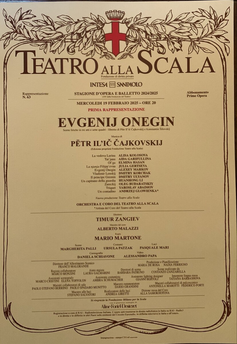 В Милане накануне состоялась премьера оперы «Евгений Онегин» (12+) Петра Чайковского. В главной роли Татьяны дебютировала известная певица Аида Гарифуллина с казанскими корнями. Среди слушателей в театре «Ла Скала» была Ирина Лядова из Набережных Челнов, которая поделилась с нами своими впечатлениями. «Я впервые в Милане и сразу решила узнать - смогу ли попасть в «Ла Скала»? Он известен даже тем, кто максимально далек от оперного искусства. Узнала, что все билеты на шесть премьерных спектаклей были проданы давно: в партер по 250 евро, на балконы – по 90 евро. И все же мне безумно повезло! Купила билет на второй этаж – в театре всего шесть этажей». Челнинка заранее пришла в театр – спектакль начинался в 20 часов. Ее место оказалось прямо над оркестром и все отлично было видно. Среди публики было немало представительных мужчин во фраках и бабочках и женщин в вечерних нарядах и с драгоценными украшениями. «Все было очень необычно, но в итоге получилось восхитительно! – не скрывает эмоций