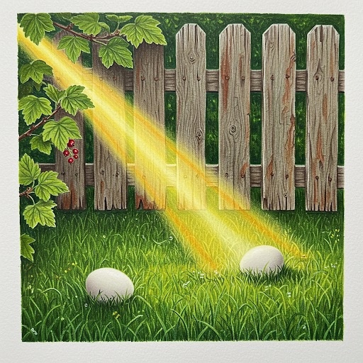 Первый солнечный луч пробежал по дорожке, перепрыгнул через забор и заглянул под смородиновый куст. Там на зелёной траве лежало яйцо. «Трак!.. Трак-трак!» Яйцо треснуло, раскололось, и на свет появился Цыплёнок. — Добро пожаловать! С днём рождения! Доброе утро! — зашелестела трава, закивали цветы, замахали крыльями бабочки. — Пи! — пискнул Цыплёнок. — Пи-пи-пи!.. — Карр! Что ты там пищишь? Ну и голос! Ничего не слышно. Голос должен быть громкий. Вот такой: «Карр! Кар-р!» — прокаркала Ворона, вспорхнула с ветки и улетела… «Громкий голос — это хорошо, — подумал Цыплёнок. — Все слышат. Но где взять этот громкий голос?.. Пойду поищу!» Большая зелёная Лягушка сидела у кадки с водой. — Ква! Ква-ква! Ква! — Доброе утро! — обратился к ней Цыплёнок. — Не могли бы вы научить меня говорить так же громко? — Ква-ква-ква! Ква-ква-ква! — засмеялась Лягушка. — Думаю, что тебе лучше поискать другой голос. И Лягушка прыгнула в воду… «Поискать? Но где?» — подумал Цыплёнок. Возле дома на солнышке гр