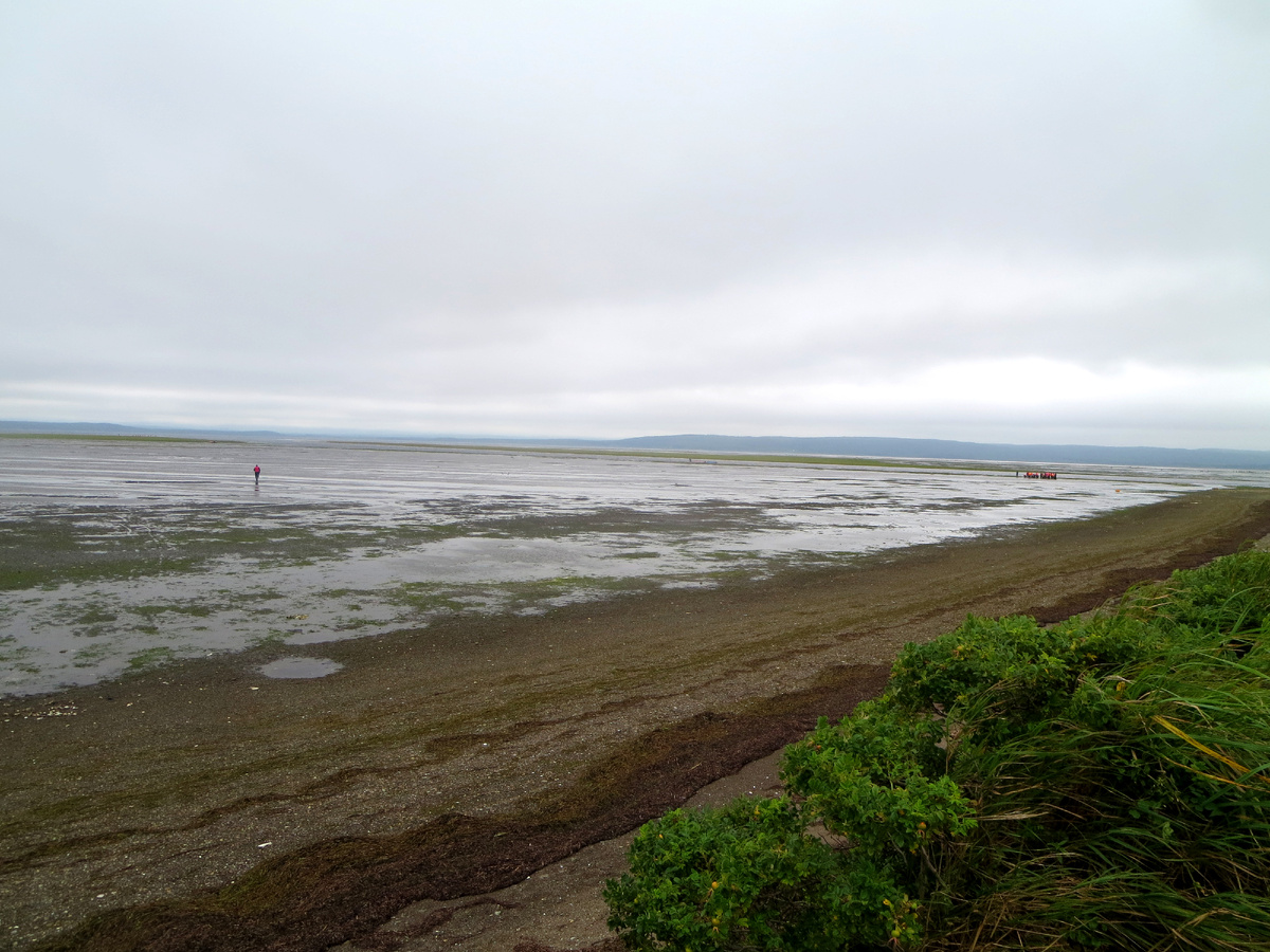 Лагуна Буссе примечательное место. За счет большого количества морепродуктов очень привлекает туристов. Наиболее значительными дарами являются устрицы, которые водятся в лагуне. Охота за устрицами происходит во время отлива, когда толпы туристов бродят по лагуне, собирая моллюсков. Отношение к устрицам у людей неоднозначное, кто-то любит их, кто-то терпеть не может. Проверить свое отношение к ним, можно только попробовав их в свежем виде. Мы решили провести этот эксперимент. Добраться до лагуны на общественном транспорте нам не удалось, автобусы в нужный день не ходили. Пришлось воспользоваться такси, которое довезло нас по дороге, до поворота на грунтовую дорогу в сторону лагуны. Дальше предстояло идти пешком. Где обитают устрицы мы не знали, поэтому сколько идти, точно не представляли. Дорога шла по косе, покрытой лугами, отделяющей лагуну от залива Анива. Мы сворачивали в каждый поворот в сторону воды, в надежде, что пришли, но устрицы не попадались. Так дошли почти до конца косы (о