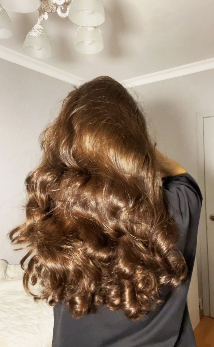 Мои волосы были не всегда такие, да генетически я выиграла густоту, но если повезло с генетикой - это еще ничего не значит. Можно собственноручно все испортить. 4 года назад мне пришла мысль в голову осветлиться и отрезать волосы по плечи, потом я захотела бахнуться челку. Сама конечно. Как вы понимаете выглядело это мягко говоря не очень + я каждый день пользовалась горячим феном, пренебрегала маскам, термозащитой, ежедневно пользовалась плойкой на 200 градусов. Мои волосы были измучены и высушены. И после всех экспериментов, 1,5 года назад уверенно решила отращивать, конечно же включила уход 1️⃣Мою шампунем 2 раза 2️⃣Бальзам 3️⃣Маска 4️⃣Термозащита перед сушкой и спрей для легкого расчесывания 5️⃣Сушу на теплом воздухе ( у меня занимает 40м из за густоты 😩🥲) 5️⃣Высушиваю используя правильную технику и расчёску, которая не дерет 6️⃣Наношу несмывашку, масло 7️⃣Кручу на мягкие бигуди и хожу с ними от 6 часов 8️⃣Принимаю 2 раза в день ОМЕГА-3, восстановила дефицит железа,