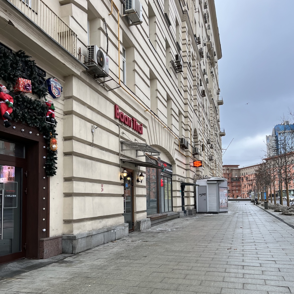 Фасад – бежевая стена сталинской постройки. Одно окно, одна дверь и красная вывеска над ней. С одной стороны бар «Креветка», с другой бывший обменник, впереди остановка, а далее вид на Кутузовский проспект.