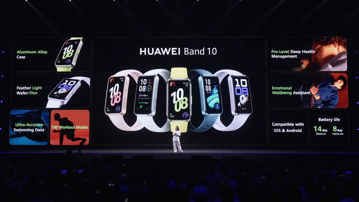 Компания HUAWEI показала новый фитнес-трекер Band 10. Одним из главных обновлений в сравнении с предшествующей моделью стал алюминиевый корпус, пришедший на смену пластиковому. А так же улучшенной функцией мониторинга сна и поддержкой мобильных платежей. Дисплей остался прежним. Это яркий 1,47-дюймовый AMOLED-экран с разрешением 194 × 368 пикселей и поддержкой Always On Display. Добавили несколько новых циферблатов: Panda Huahua, Starry Vista, Power Joy, Super Watch. Как говорилось ранее новинка получила Алюминиевый корпус толщиной 8,99 миллиметра Из-за более премиального материала вес аксессуара увеличился, но незначительно — с 14 до 15 граммов. При этом гаджет остался компактным. Габариты: 43,45 × 24,86 × 8,99 мм. Боковые грани Huawei Band 10 матовые, а кромка вокруг экрана — отполированная. HUAWEI Band 10может похвастаться водонепроницаемостью по стандарту 5 ATM, что позволяет погружать браслет на глубину до 50 метров. Кастомизировать фитнес-трекера можно с помощью виртуальных цифер