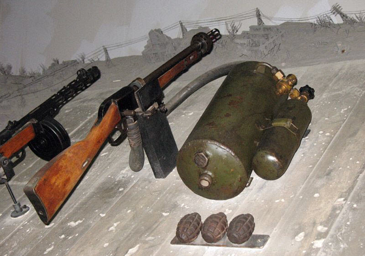 Один из экспонатов музея панора-мы Сталинградская битва - советский огнемет РОКС-3 (Ранцевый огнемет Клюева - Сергеевна). Масса - 23 кг. Максимальная дальность - 40 м.