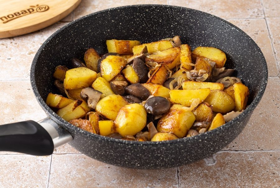 Жарьте картофель на среднем огне, периодически помешивая, до золотистой корочки (примерно 15-20 минут).
