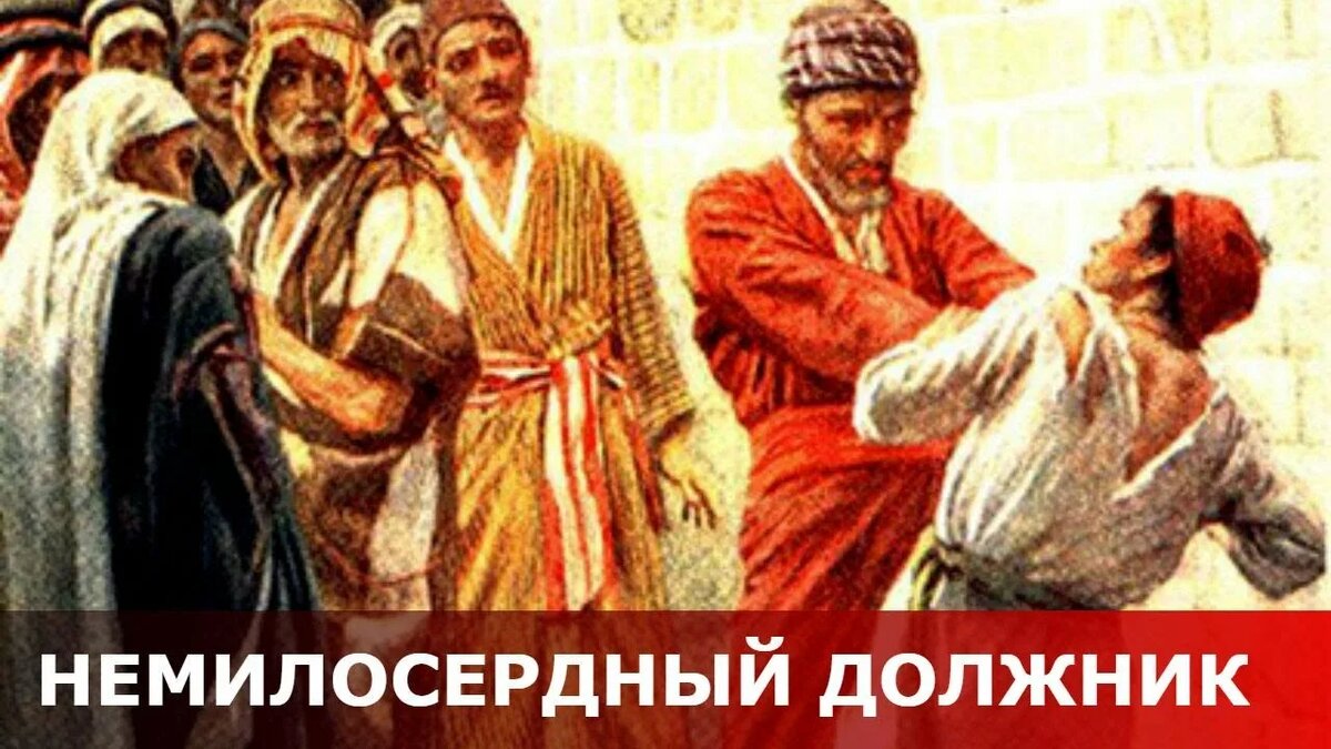 «Царство Небесное подобно царю, который захотел сосчитаться с рабами своими. Когда начал он считаться, приведён был к нему некто, который должен был ему десять тысяч талантов (вес серебра); А так как он не имел, чем заплатить, то государь его приказал продать его, и жену его, и детей, и всё, что он имел, и заплатить. Тогда раб тот пал, и кланяясь ему, говорил: Государь! Потерпи на мне, и я всё тебе заплачу. Государь, умилосердившись над рабом тем, отпустил его и долг простил ему. Раб же тот, выйдя, нашёл одного из товарищей своих, который должен был ему сто динариев, и, схватив его, душил, говоря: отдай мне, что должен. Тогда товарищ его пал к ногам его, умолял его и говорил: потерпи на мне, и всё отдам тебе. Но тот не захотел, а пошёл и посадил его в темницу, пока не отдаст долга. Товарищи его, видев происшедшее, очень огорчились, и, придя, рассказали государю своему всё бывшее. Тогда государь его призывает его и говорит: злой раб! Весь долг тот я простил тебе, потому что ты упросил меня. Не надлежало ли и тебе помиловать товарища твоего, как и я помиловал тебя? И, разгневавшись, государь отдал его истязателям, пока не отдаст ему всего долга. Так и Отец Мой Небесный поступит с вами, если не простит каждый из вас от сердца своего брату своему согрешений его» (Мф. 18: 23–35).