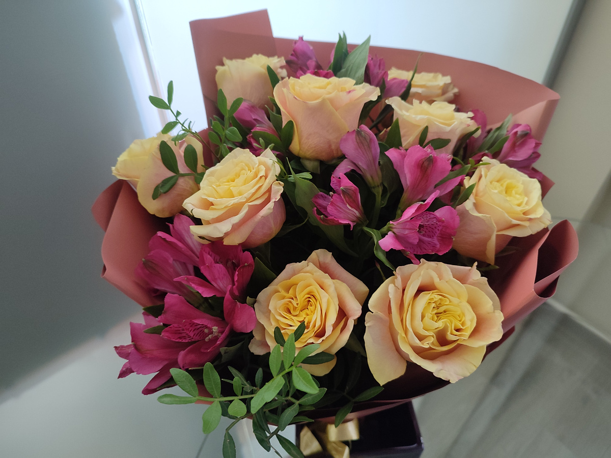 Я металась между тем, что мне не нравилось, и тем, что мне совсем не нравилось. Придушив внутреннего перфекциониста, и без того еле живого, я остановилась на персиковых розах и малиновой альстромерии. Пусть будет хоть что-то теплое, летнее, бархатное в эту неласковую, скупую на снежность зиму.