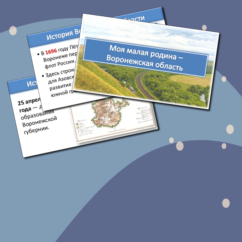 В 2025 году Воронежская губерния отмечает значимый юбилей — 300 лет с момента своего основания. Этот долгий путь от фундамента российского флота до современного культурного и промышленного центра страны заслуживает особого внимания. Воронежская область, в которой переплетаются исторические события, культурные традиции и современные достижения, становится символом мужества, стойкости и развития. Воронежская губерния известна не только своей историей, но и яркими культурными традициями: Подробнее это вопрос освещен в моей презентации. Сегодня Воронежская область активно развивается и продолжает вносить свой вклад в экономику и культуру страны: Юбилей Воронежской губернии — это не только повод для гордости за достижения, но и возможность подумать о будущем региона. Важно сохранять и развивать культурное наследие, укреплять промышленность, инвестировать в науку и образование, чтобы Воронежская область оставалась важным центром на карте России. Если вы хотите узнать больше о значении Вороне