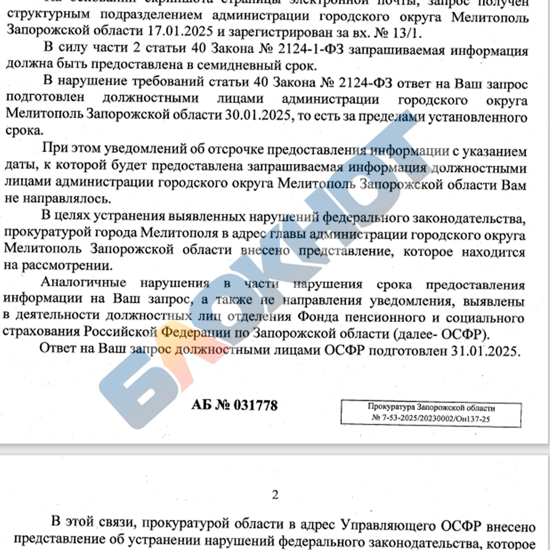 Ответ из мэрии не пришёл в указанный срок. Редакция «Блокнот Запорожье» добивалась решения вопроса трудового стажа одного из обратившихся в редакцию читателей. Мы направили запросы в Соцфонд Запорожской области и администрацию Мелитополя, чтобы прояснить ситуацию. В электронных письмах на почты ведомств, наша редакция интересовалась лишь тем, почему чиновники отказываются выполнять просьбы Путина. Президент на прямой линии заявлял о том, что проблемы, связанные с трудовой книжкой, должны решать быстро, оперативно и в пользу жителей новых регионов. Напомним, ответы на запросы от СМИ должны поступать в течение семи дней с момента получения. Это регламентируется статьей 40 Закона РФ «О средствах массовой информации». Если же власти не могут ответить в нужный срок, то они обязаны уведомить об отсрочке ответа - это нужно сделать в трёхдневный срок, чего ни в мэрии Мелитополя, ни в СФР по Запорожской области не сделали. Оба запроса были отправлены 17 января, соответственно, ответить на них с